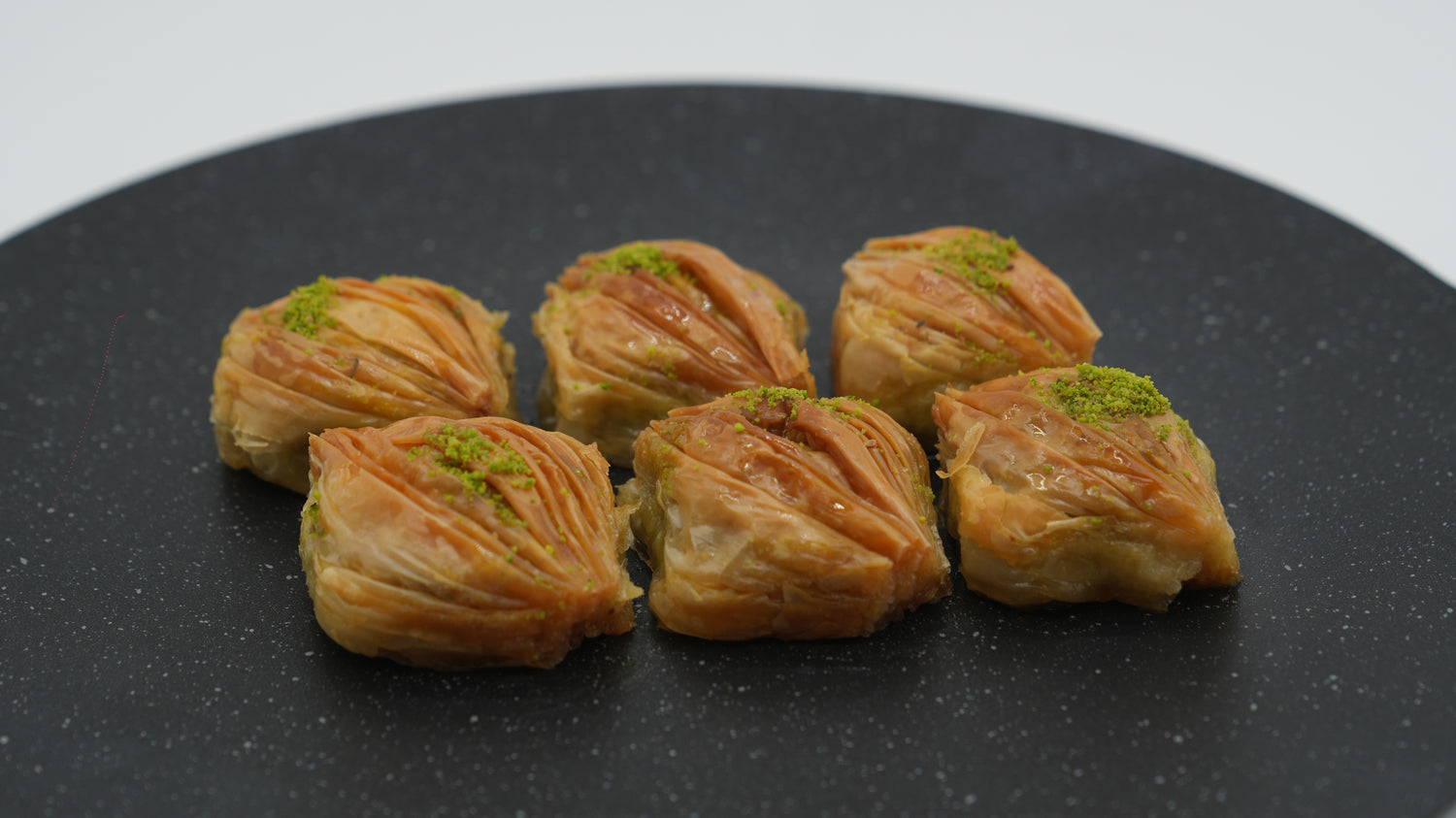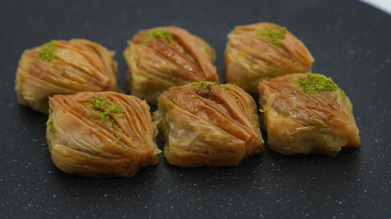 Crispy layers 🥮, rich pistachios 🌰, melted butter 🧈, and sweet honey 🍯.